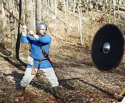 Another approach to using a Viking shield has recently been suggested, similar to the peek-a-boo guard used by modern boxers. The shield is held up near the head, with the shield hand near the face. The position provides significant protection to the head and to the all-important central nervous system. |