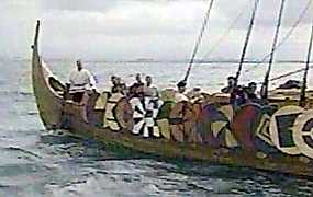 On board ship, shields were arrayed along the gunwales, providing some additional protection from wind and waves to the crew. The photos show the Íslendingur, a modern Viking ship reproduction, off the coast of Iceland as she began her voyage to North America in the year 2000. Hung along the sides, the shields interfere with the operation of the ship, so some believe shields were arrayed in this manner only to create an imposing appearance while entering or leaving harbor. |