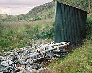 Not all baths were as nicely turned out as Grettislaug. The hot spring bath at Heydalur in Mjóifjörđur is shown to the right. A depression in the ground collects the water from the hot spring. Despite the simple setup, it is a relaxing place to soak. The photo to the left shows the hot springs on the hillside at Laugarhús in Hrafnkelsdalur. When turf is added to the dam in the foreground, warm water collects in the muddy depression around the source of the hot spring in the background. Today, the water is collected and used for drinking water for the sheep at Laugarhús. |