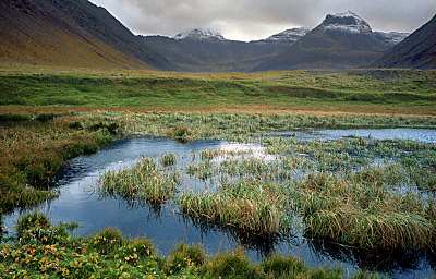 From his hiding place in the pass, Egill had an excellent view of the games field south of Knörr (right). Several ponds exist there today where the game could have been played. However, the games festival was held on Winter Nights (veturnætur), the beginning of the winter in the Norse calendar. This was a time for sacrifices, game festivals, and weddings, and it occurred in mid-October. In October, the mean temperature in that part of Iceland is above freezing, so it seems unlikely that ice had formed on the ponds. The photo to the left shows the likely location of the game fields near Knörr on a recent Winter Nights. While the surrounding mountains are freshly dusted with snow, the playing fields show no signs of ice or snow. |