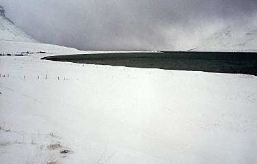 Later in the saga (G.s. ch18), games were held at Seftjörn in the winter. Þorsteinn brought Börkur down on the ice. However, the "ice" is actually svell, a word that implies uneven or lumpy ice and is usually applied to ice that has formed on land, rather than over a body of water. In this winter photo of Seftjörn, the pond lays buried beneath the snow in the foreground. The body of water is Dýrafjörður, located behind the snow covered pond. It's unlikely any kind of game was played on a pond as snowy as this one. |
