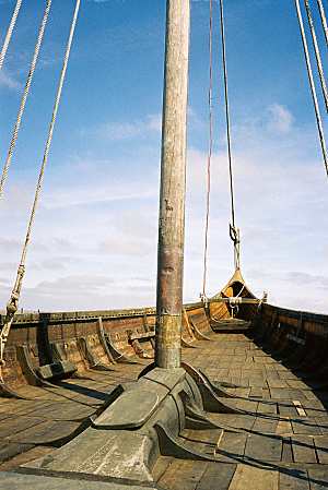 The skipper of the Viking Saga told me that the ship can easily capsize when the wind is from abeam. That explains how, on one hand, Viking-era ships can be described as performing well in adverse conditions, and how, on the other hand, the sagas describe ships being blown far off their intended course under adverse wind conditions. In stiff winds, a Viking ship would have to be steered in a direction to keep the wind off the beam. The skipper also commented that the Viking ship sails very differently from a modern sailing vessels of similar size. He said some practice was needed to become familiar with the ship's idiosyncrasies, but once mastered, "the ship sails herself". |