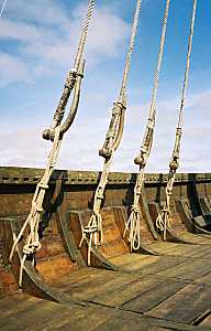 The carvings of ships under sail made during the Viking age (left) show an interlace at the foot of the sail. It has been suggested that this was used to fine tune the curve of the sail to get the best speed possible as close to the wind as possible. Another explanation is that the interlace was used to reef the sail in high winds. Pulling on the bottom of the interlace caused the sail to pucker, reducing its effectiveness. The carvings also show a cross-hatch pattern on the sail whose purpose is unknown. It has long been thought simply to be artistic license. Recently, it's been suggested that the cross-hatch was actually walrus-hide (or other leather) reinforcements. The homespun wool used for sails was probably not strong enough to hold its shape. As a result, the wind would blow the sail out of shape in time. Walrus-hide reinforcements created a more stable sail that set well. As far as I can tell, this idea is pure speculation, without any evidence to back it up. |