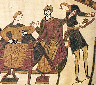 The keel, stem, and sternpost were by far the most critical components of the ship. Errors in the design or construction of these components resulted in a ship with poor sailing characteristics. It's not known what, if any, measurement instruments were used. It's certain that ship-builders had a very clear mental picture of the completed ship during the construction process. In this illustration from the Bayeux tapestry, William gives instructions for the construction of his invasion fleet to his ship-builder, who holds a T-shaped broad axe in his hand. |