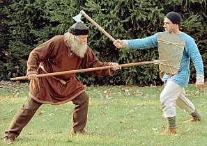 In another case, it was done by an unarmed man while under attack. In chapter 39 of Finnboga saga ramma, Þorgrímur grabbed a hidden sword and attacked Finnbogi, who was unarmed. Finnbogi threw his cloak over the sword to reduce its effectiveness, and then grappled with Þorgrímur, bringing him down and killing him. One might think it would be easy for a swordsman to continue fighting with a cloak on his sword, or at least to throw it off. The cloak, weighing nearly as much (if not more than) the sword significantly unbalances it, making control of the sword difficult. Additionally, if the cloak is thrown with a twist (like throwing out a fishing net) it entangles itself around the swordsman's arm and weapon (and head), making removal difficult and possibly resulting in a disarm. A speculative reconstruction of a disarm with a cloak is shown in this combat demo video, part of a longer fight. The video linked on the left shows how a cloak can be thrown from the side to entangle a swordsman. The photo on the right shows a round of sparring in which a cloak is used to defend against two swords in a Hurstwic Viking combat training session. |