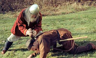 In several battles, Gunnar thrust his atgeirr through his opponent, lifting him off his feet, and then hurling the body away (right). |
